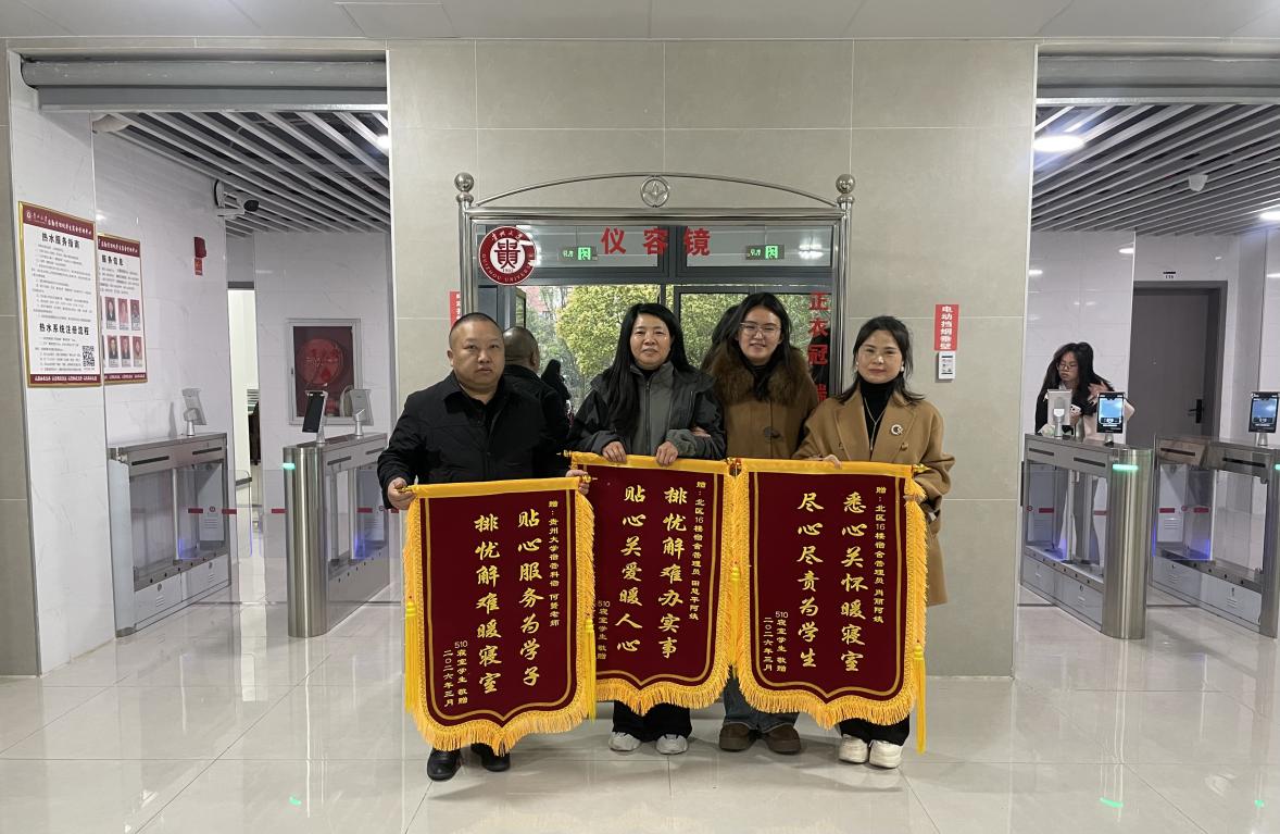 (文/胡悦)2026年3月16日,贵州大学东校区16栋510寝室的同学带着满心感激,将三面分别绣有“贴心服务为学子,排忧解难暖寝室”“排忧解难办实事,贴心关爱暖人心”“悉心关怀暖寝室,尽心尽责为学生”的锦旗,郑重地送到了后勤管理处学生宿舍管理中心。这份特殊的礼物,饱含着同学们对后勤管理团队快速解决热水机组噪声问题、用心优化住宿环境的诚挚谢意。